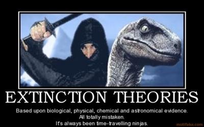 I think Ninjas came from the future to kill dinosaurs for meat.